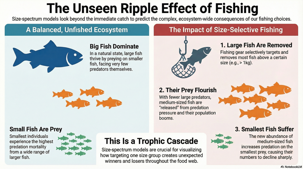 One of the key advantages of size-based multi-species models is that they provide a more comprehensive understanding of the impacts of fishing on fish populations and ecosystems. By considering the size distribution of different fish species, these models can capture the effects of fishing on both target and non-target species, and on different life stages of a species. This is particularly important for species that are caught as bycatch or that are indirectly affected by fishing through changes in their food web.