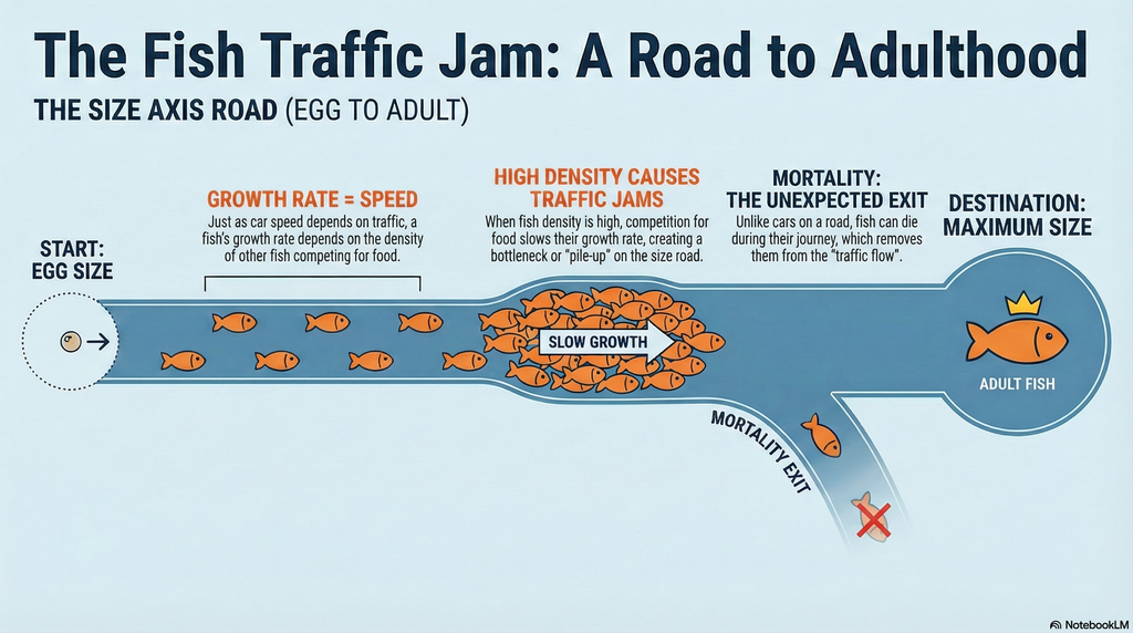 It is interesting to think of the marine ecosystem as a transport system that moves biomass from the size of primary producers (mostly unicellular plankton) up to the sizes of fish that humans like to consume. Each fish that grows up from egg size to maturity by eating smaller individuals is like a car on this biomass highway. The yield of our fisheries depend on this traffic flowing smoothly and without traffic jams.